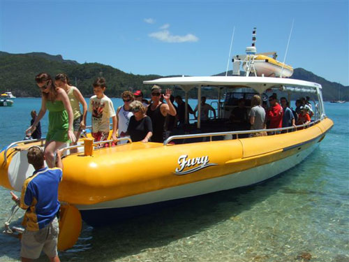 No need to be transferred by dingy, Fury's shallow draft allows her to pull up right on the beach.